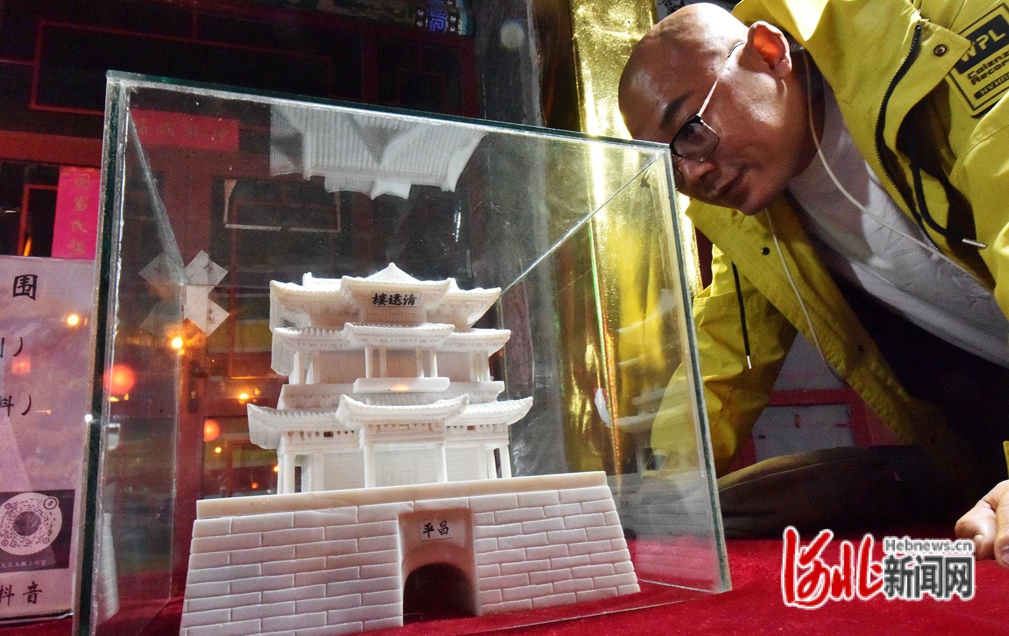 一名游客被一件缩微版清远楼玉雕吸引。陈晓东摄